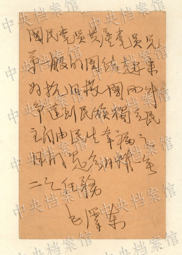 Mao Zedong wrote that the Kuomintang members and the members of the CPC should be united to fight against Japanese aggression and fight for the national independence, democracy, freedom and well-being of the Chinese people in July 1937. (Photo/China's State Archives Administration)