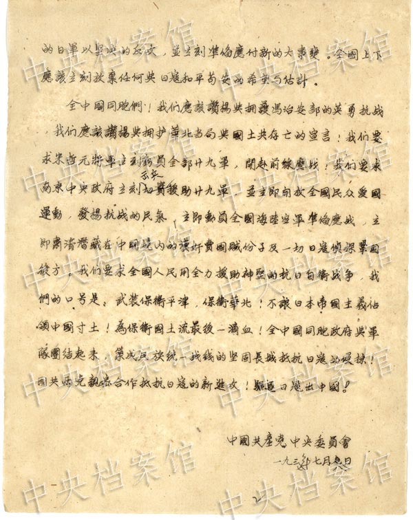 On July 8, 1937, The Communist Party of China (CPC) published an open telegram to the nation. (Photo/China's State Archives Administration)