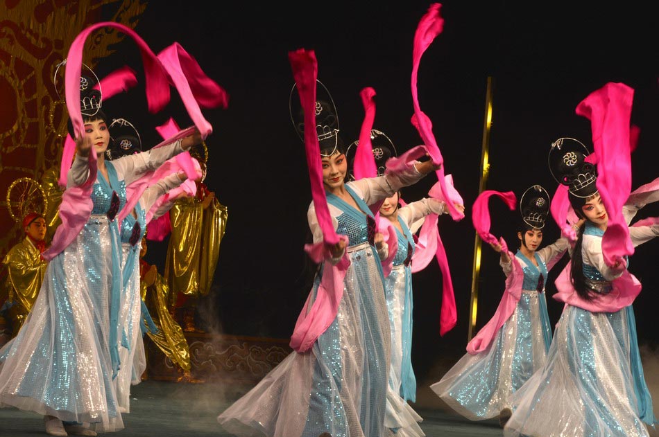 The actresses perform Beijing Opera "The Goddess Scatters Flowers" during a preview for media at Lincoln Center in New York City.