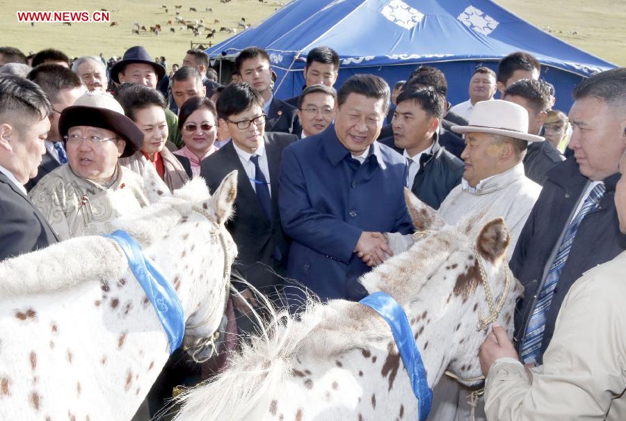 Mongolian President Tsakhiagiin Elbegdorj presents two Mongolian horses to Chinese President Xi Jinping and his wife while they watch "Nadam Fair ", a traditional Mongolian pageant for entertainment and games, in Ulan Bator, Mongolia, Aug. 22, 2014. (Xinhua/Ju Peng)
