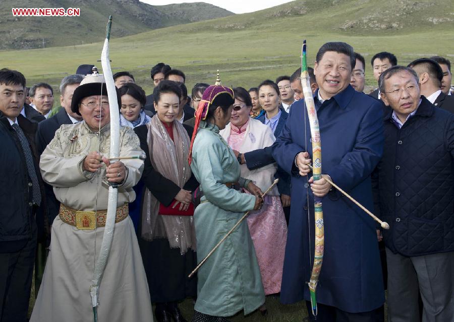 Chinese President Xi Jinping and Mongolian President Tsakhiagiin Elbegdorj prepare to shoot arrows while they watch "Nadam Fair ", a traditional Mongolian pageant for entertainment and games, in Ulan Bator, Mongolia, Aug. 22, 2014. (Xinhua/Huang Jingwen)