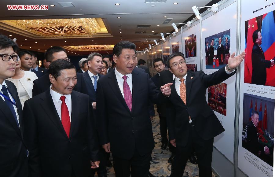 Chinese President Xi Jinping and Mongolia's Prime Minister Norov Altankhuyag attend the opening ceremony of an exhibition about the past economic and trade cooperation between China and Mongolia in Ulan Bator, Mongolia, Aug. 22, 2014. (Xinhua/Pang Xinglei)