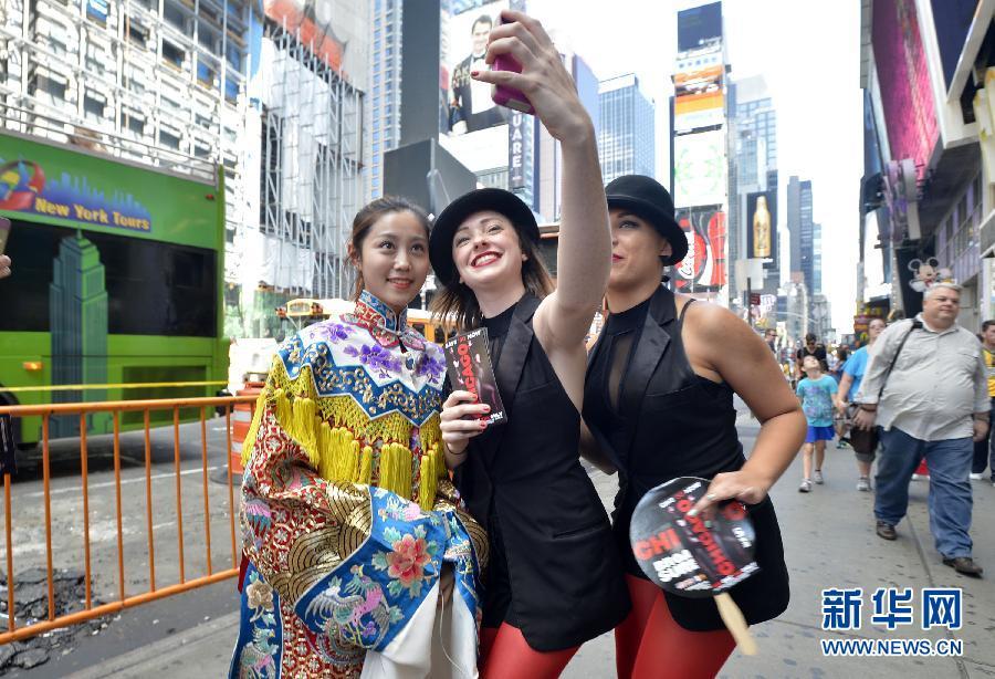 Peking opera actress Wang Mengting, dressed in opera costume, promotes the art of Peking opera to people at the Times Square, NYC. (Xinhuanet/Wang Lei)