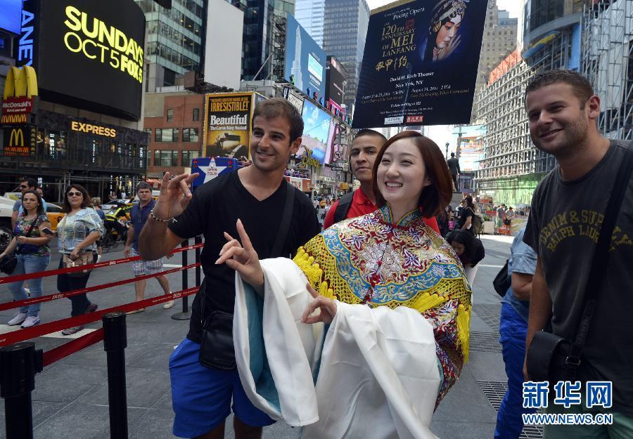 Peking opera actress Dou Xiaoxuan, dressed in opera costume, communicates with people on the street about Peking opera. (Xinhuanet/Wang Lei)