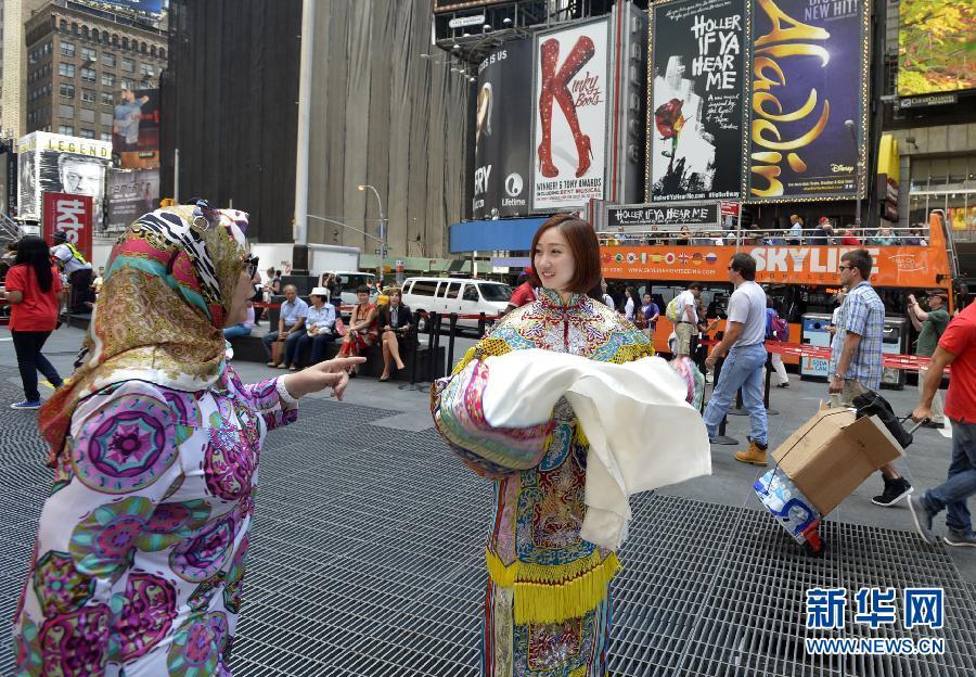 Peking opera actress Dou Xiaoxuan, dressed in opera costume, communicates with people on the street about Peking opera. (Xinhuanet/Wang Lei)