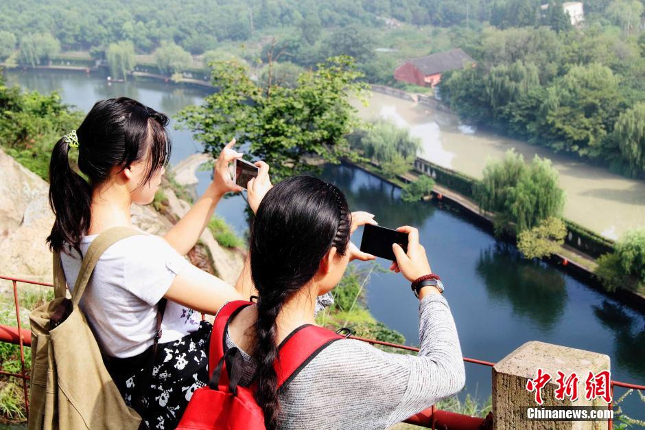 Tourists take photos for a river boasting different water quality conditions in Shaoxing city, east China's Zhejiang province on Aug. 21, 2014. (Photo: China News Service/Li Ruichang)