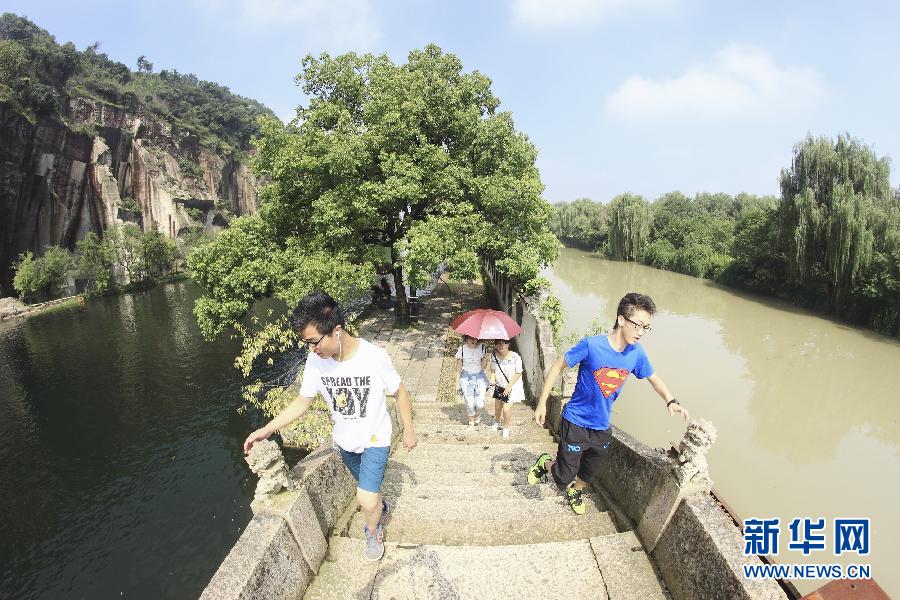 | Photo taken on Aug.21, 2014 shows a river that boasts different water quality conditions in Shaoxing city, east China's Zhejiang province. On one side of the wall, tourists enjoy beautiful landscapes on a bridge over the clear water at the city's Donghu Scenic Zone. However, on the other side of the wall, the water of the river looks yellow due to pollution and sediments transported by mountain torrents after consistent heavy rains in the region. (Photo: China News Service/Li Ruichang) |