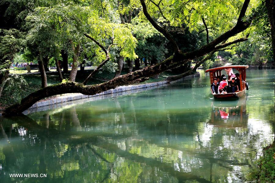 Tourists go sightseeing at the Ling Qu Canal in Xing'an county, southwest China's Guangxi Zhuang Autonomous Region, Aug. 23, 2014. Built in the Year 214 BC, the Ling Qu Canal is one of the oldest canals in the world which links the Xiangjiang River and Guijiang River to form a north south waterway of the region. (Xinhua/Wang Zichuang)