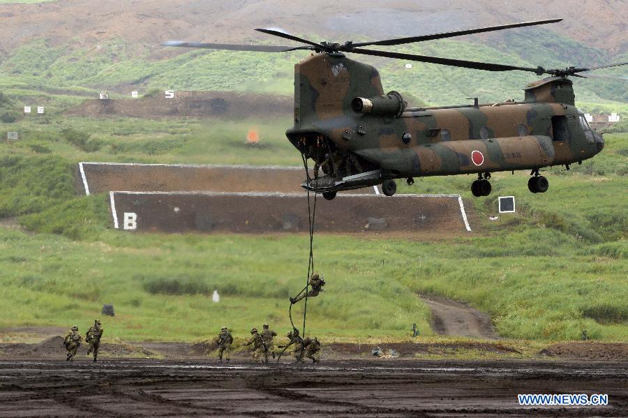The Japanese Ground Self-Defense Forces (GSDF) attend live-fire drill at foothill of Mt. Fuji, Aug. 24, 2104. The Japanese GSDF on Sunday held an annual live-fire military drill in the GSDF maneuver field at the foothill of Mount Fuji in Gotemba city in Shizuoka Prefecture, with the participation of Defense Minister Itsunori Onodera. (Xinhua/Ma Ping)