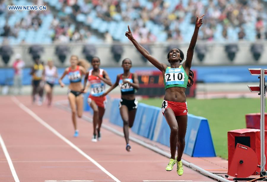 Gold Medalist Kokeb Tesfaye Alemu of Ethiopia holding her national flag, celebrates after the Women’s 1500m Final of athletics event at the Nanjing 2014 Youth Olympic Games in Nanjing, capital of east China's Jiangsu Province, Aug. 25, 2014. (Xinhua/Liao Yujie)