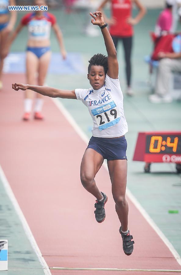 Gold Medalist Yanis Esmeralda David of France competes in the Women’s Triple Jump of athletics event at the Nanjing 2014 Youth Olympic Games in Nanjing, capital of east China's Jiangsu Province, Aug. 25, 2014. (Xinhua/Yang Lei)