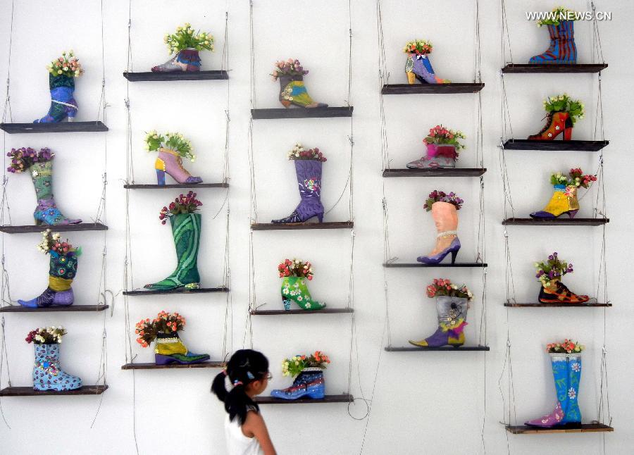 | A visitor looks at artworks made with flowers and used footwares during the First Suzhou International Children's Visual Arts Biennial Exhibition in Suzhou, east China's Jiangsu Province, Aug. 24, 2014. Over 1,000 visual artworks done by kids around the world will be shown during the First Suzhou International Children's Visual Arts Biennial Exhibition, which is available from Aug. 23 to Sept. 14 in Suzhou. (Xinhua/Wang Jiankang) |