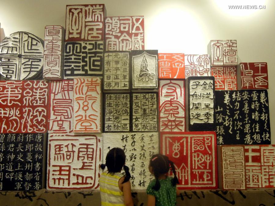 Young visitors look at foamed plastic seal carvings during the First Suzhou International Children's Visual Arts Biennial Exhibition in Suzhou, east China's Jiangsu Province, Aug. 24, 2014. Over 1,000 visual artworks done by kids around the world will be shown during the First Suzhou International Children's Visual Arts Biennial Exhibition, which is available from Aug. 23 to Sept. 14 in Suzhou. (Xinhua/Wang Jiankang)