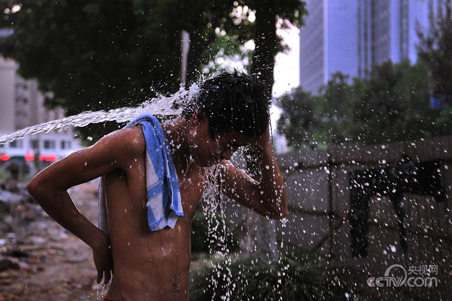 Li takes a cold shower with his colleagues at a construction site in Jiaxing, east China's Zhejiang province on July 29, 2013. Li is a college student. He works in summer holidays to earn the tuition. (Photo/CNTV)