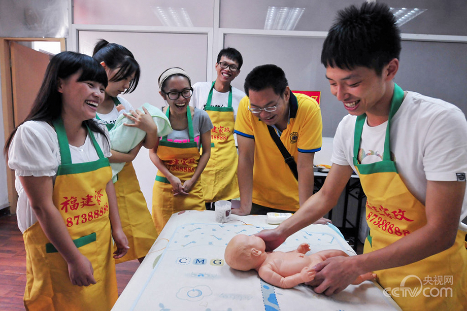 Students receive nanny training in Fuzhou in southeast China's Fujian province on July 17, 2013. After 5 days training, they will become the college student nannies for the summer holidays. (Photo/CNTV)