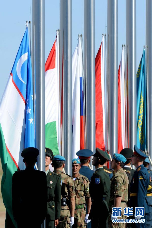 Participating troops from different countries hold national-flag-raising ceremony in the “Peace Mission -2014” anti-terror drill at the Zhurihe training base, north China's Inner Mongolia Autonomous Region on August 23, 2014. (Xinhua News Agency/Zhang Ling)
