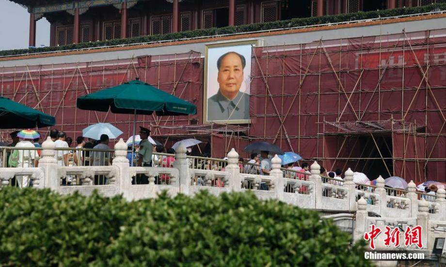 To embrace the 65th founding anniversary of People's Republic of China, Tiananmen, the famous monument and national symbol in Beijing, is ready for repaint and repairs on Aug. 20, 2014. (Photo/CNS)