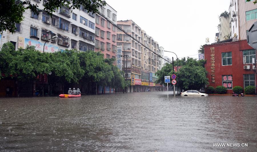 Rescuers work on a rubber dinghy on a flooded road in Yuechi County of Guang'an City, southwest China's Sichuan Province, Aug. 26, 2014. A rainstorm hit the county on Tuesday, causing a serious urban waterlogging. (Xinhua/Hu Zuobin)