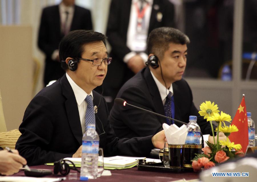 | China's Commerce Minister Gao Hucheng (L) speaks during the China-ASEAN Economic Ministers Consultation in Nay Pyi Taw, Myanmar, on Aug. 26, 2014. (Xinhua/U Aung) |