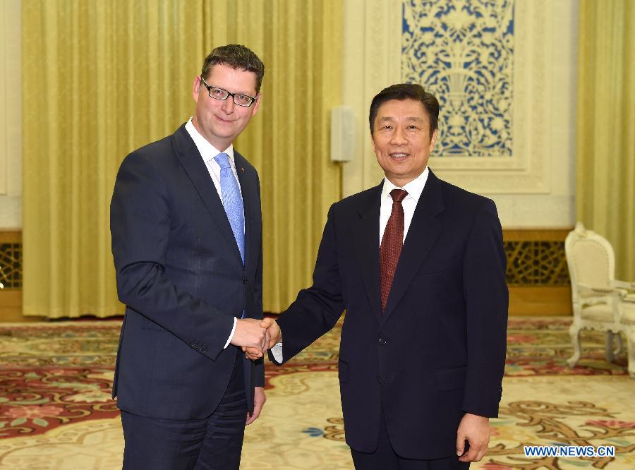 Chinese Vice President Li Yuanchao (R) meets with Thorsten Schaefer-Guembel, vice chairman of the Social Democratic Party of Germany, in Beijing, capital of China, Aug. 26, 2014. (Xinhua/Ma Zhancheng)