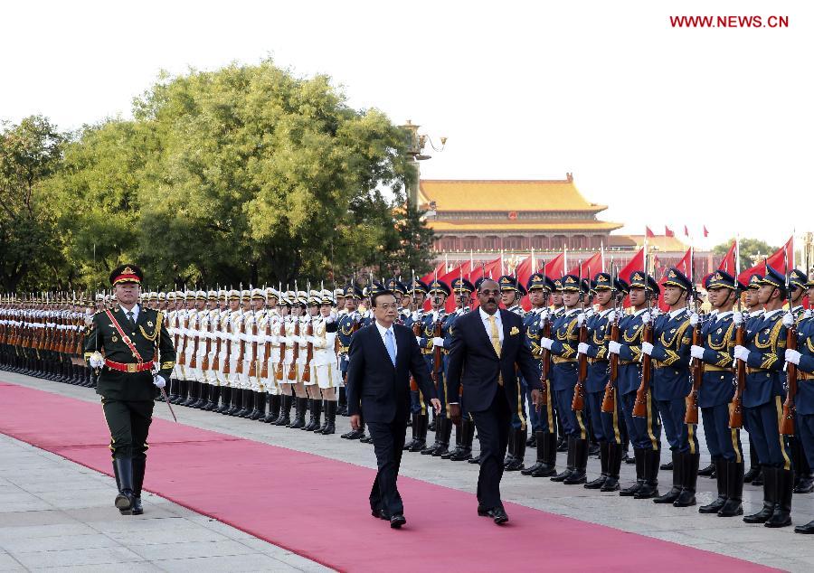 Chinese Premier Li Keqiang (2nd L) holds a welcome ceremony for Antigua and Barbuda Prime Minister Gaston Browne in Beijing, China, Aug. 26, 2014. (Xinhua/Ding Lin)
