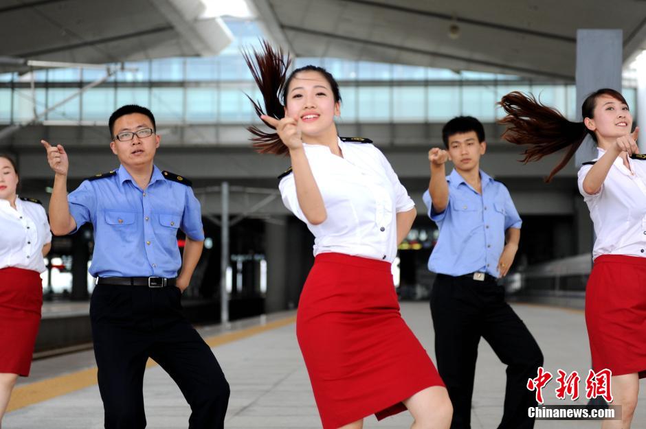 The stewards at Xi'an North Railway Station dance to "Little Apple" to welcome the passengers on Aug. 21, 2014, in Xi'an, northwest China's Shaanxi province. By the Chopsticks Brothers, "Little Apple" is one of the most popular songs in China. (Photo/CNS)