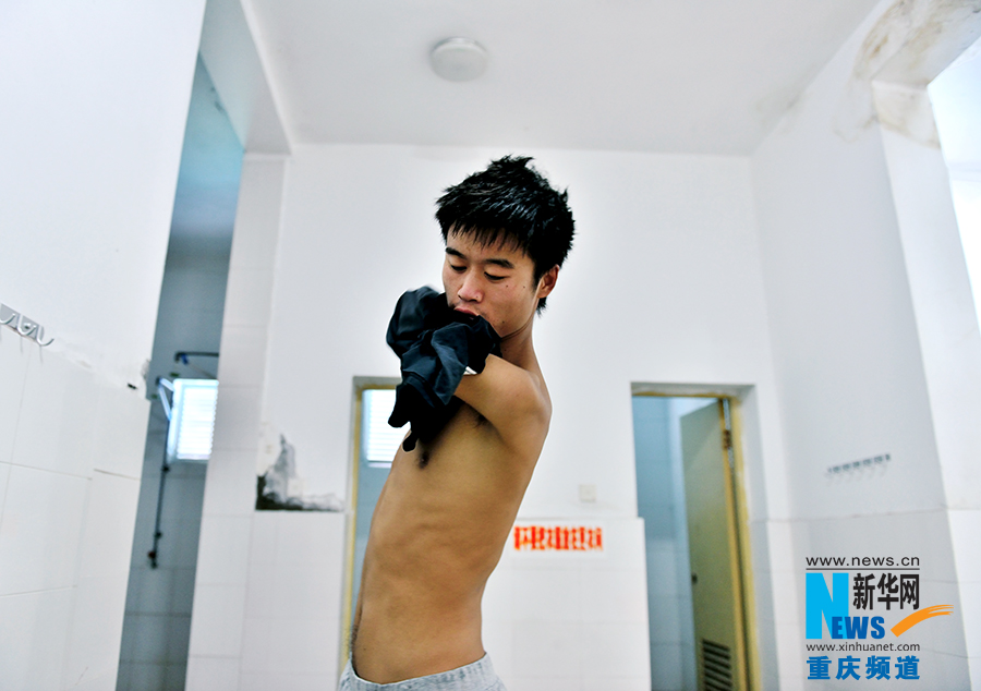 Wang Hu dress himself using the mouth and arms on Aug. 21, 2014. (Photo/Xinhua)