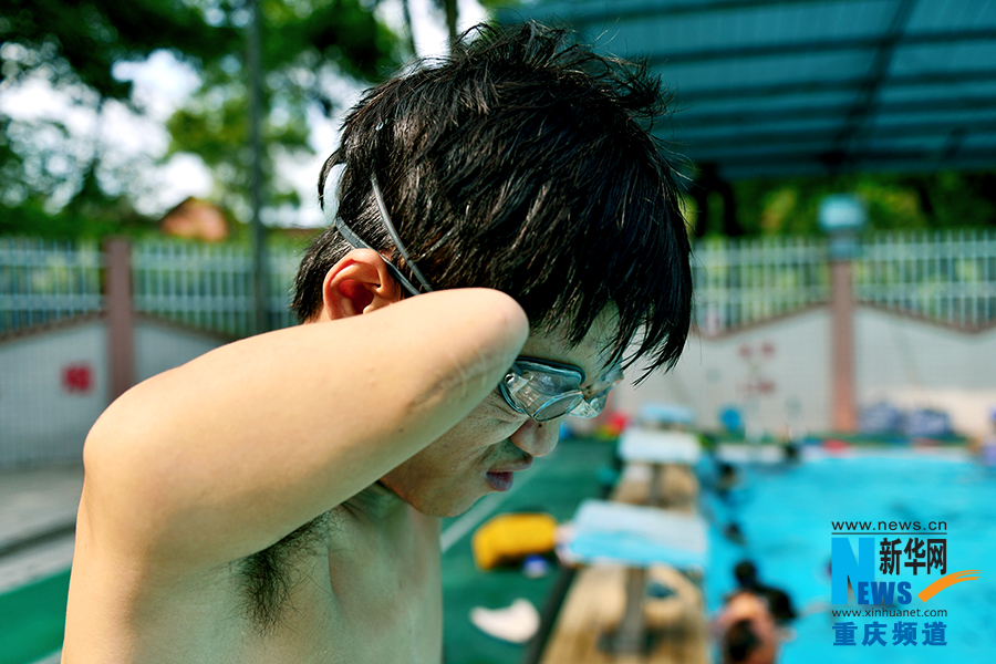 Wang Hu takes swim training in the swimming pool of Southwest University in Chongqing on Aug. 21, 2014. (Photo/Xinhua)