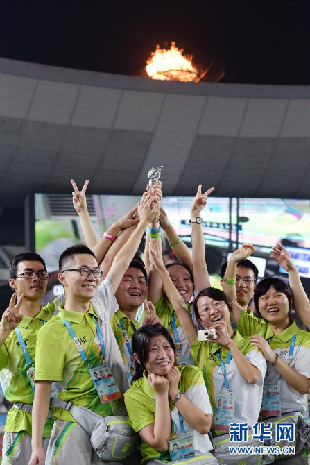 Volunteers take group photos in the carnival on Aug. 25, 2014. (Xinhua/Chen Cheng)