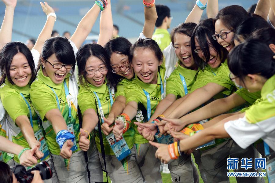Volunteers take group photos in the carnival on Aug. 25, 2014. (Xinhua/Chen Cheng)