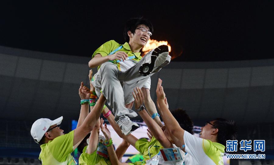 A volunteer is up thrown by his partners at the carnival on Aug. 25, 2014. (Xinhua/Chen Cheng)
