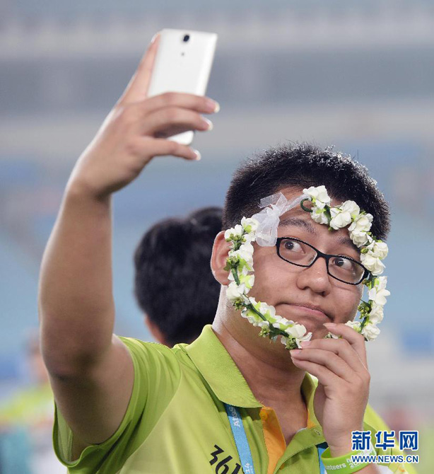 A volunteer takes selfie at the carnival on Aug. 25, 2014. (Xinhua/Chen Cheng)