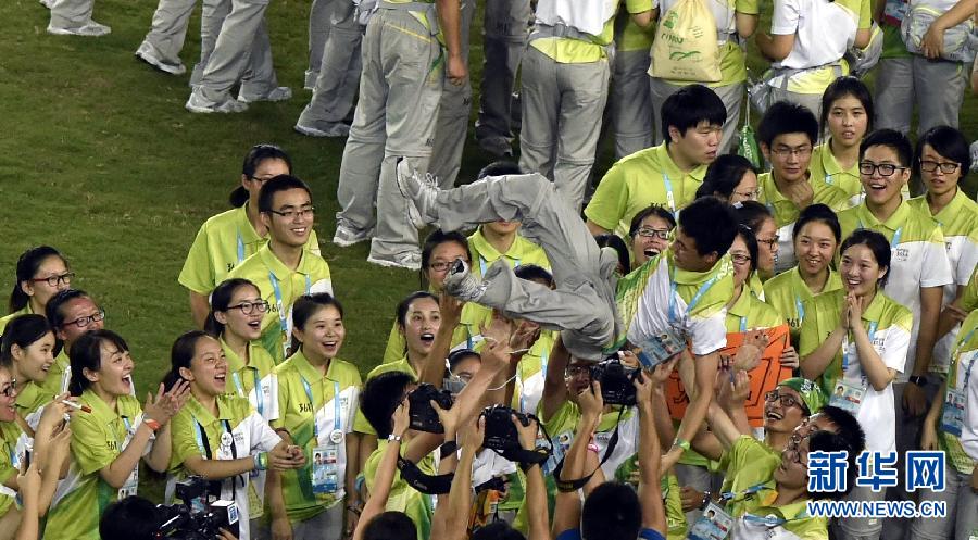 More than 800 volunteers attend a carnival party to bid farewell to the Youth Olympic after track and field competition at Nanjing Olympics Center on Aug. 25, 2014. Organizers conferred awards on voluntary groups to honor their contributions to the games.