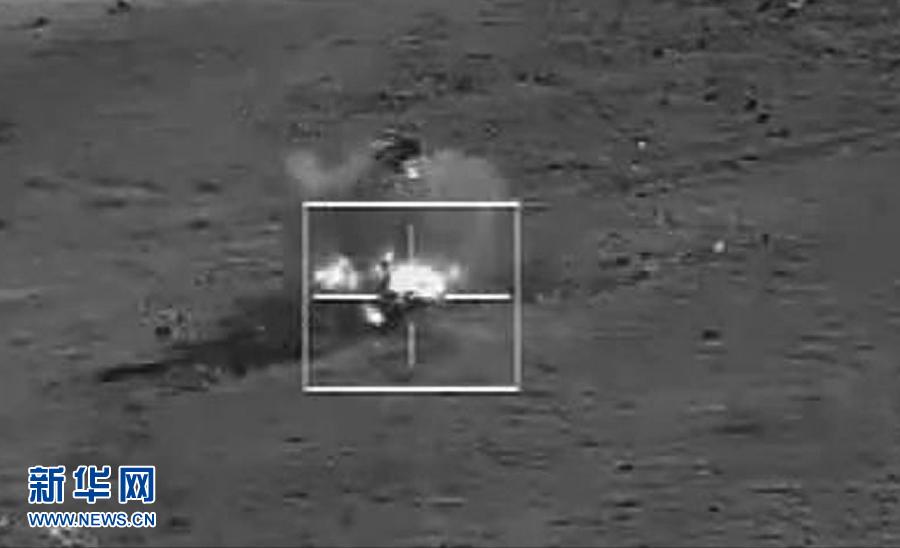 Photo taken on Aug. 26 shows China's drone shooting off a missile during the drill. China's military drones participated in the Shanghai Cooperation Organization (SCO) anti-terror drills in Inner Mongolia for the first time on Aug. 26, 2014. (Photo source: news.cn)