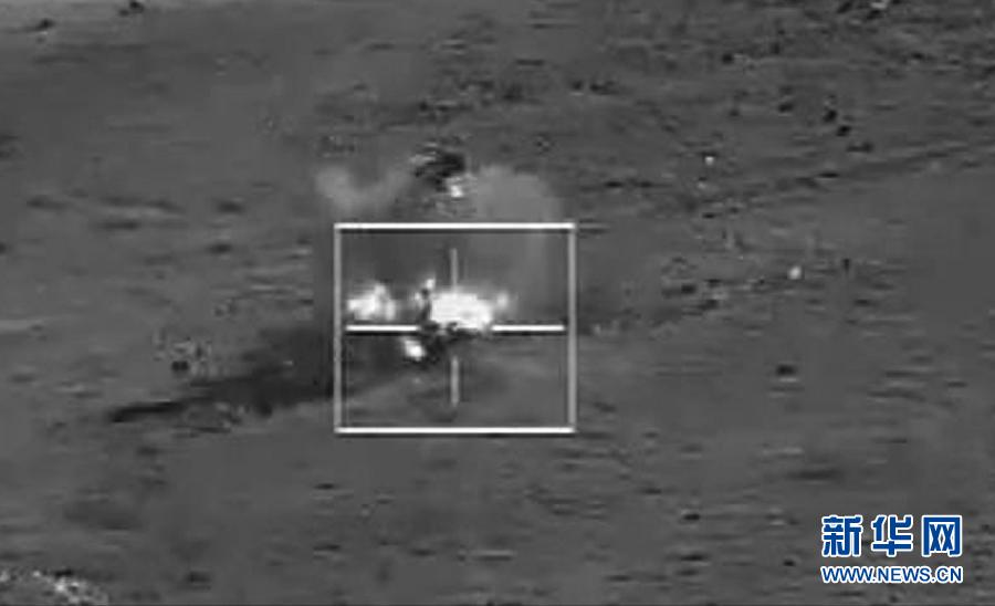 Photo taken on Aug. 26 shows China's drone shooting off a missile during the drill. China's military drones participated in the Shanghai Cooperation Organization (SCO) anti-terror drills in Inner Mongolia for the first time on Aug. 26, 2014. (Photo source: news.cn)