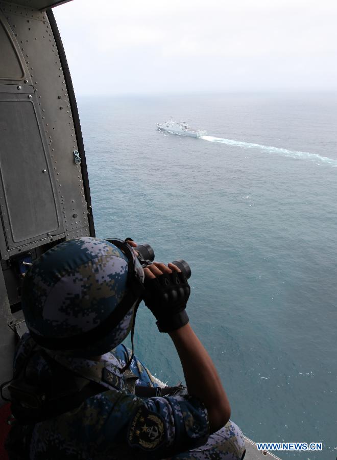 A Chinese Navy soldier observes from a helicopter during an escort mission in the Gulf of Aden, Aug. 26, 2014. This is the 18th convoy fleet sent by the Chinese People's Liberation Army Navy for these missions since 2008. (Xinhua/Zhang Yuelin)