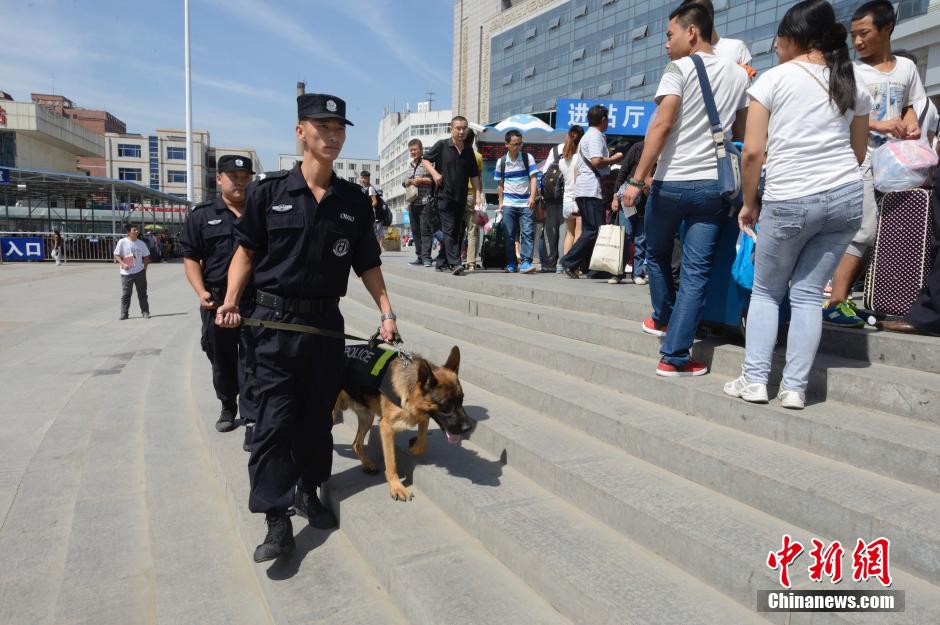 Two police dogs are on duty, searching for prohibited materials in the square of the railway station in Hohhot, capital of Inner Mongolia Autonomous Region on Aug. 26, 2014. Recently, 19 German shepherd dogs joined the police dog training team in the city. The police dogs have joined routine patrols in densely-populated areas. They are expected to help the police deal with terrorist attacks and keep order in large-scale gatherings. (China News Service/Liu Wenhua)