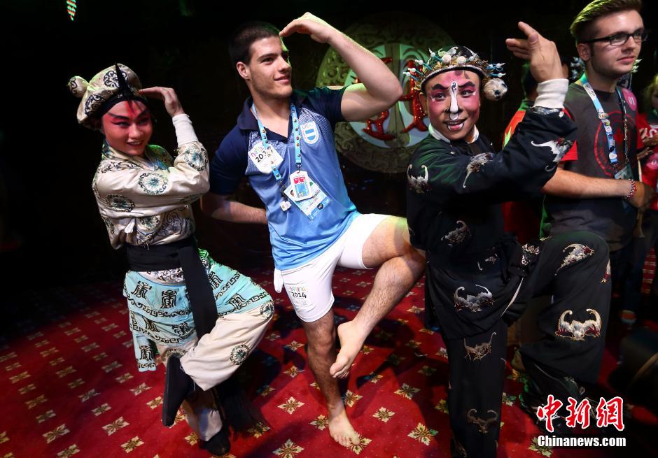 An athlete learns Beijing opera poses with artists, Aug. 24, 2014. (China News Service/ Yang Bo)