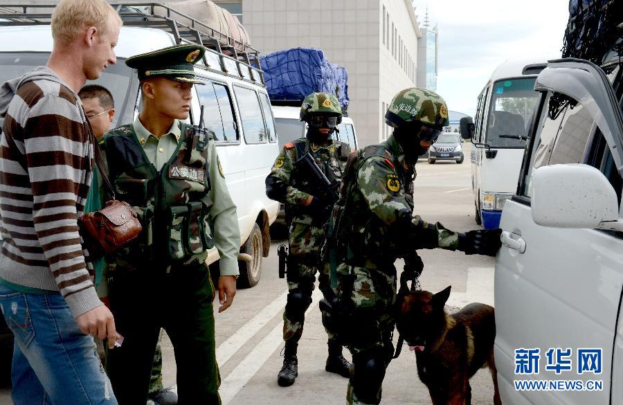 The frontier soldiers examine cars at the border in the drill on Aug. 26, 2014. (Xinhua/Wang Xiaoxue)