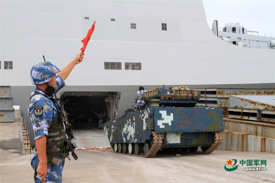 Amphibious armored cars are load. (China Military Online/Liao Zhiyong)