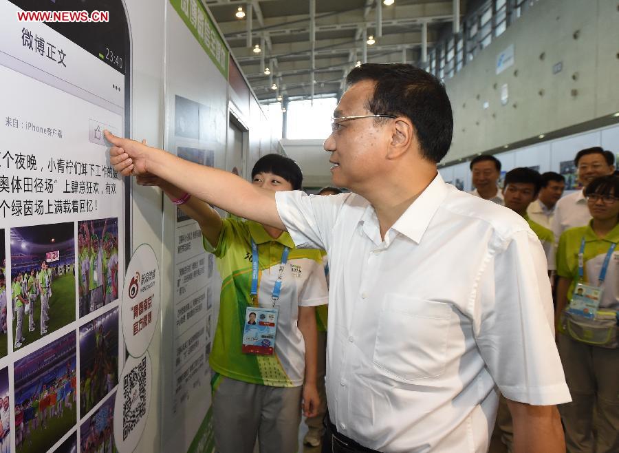 Chinese Premier Li Keqiang visits volunteers of the second Summer Youth Olympic Games in Nanjing, capital of east China's Jiangsu Province, Aug. 28, 2014. Li Keqiang is to attend the closing ceremony of the second Summer Youth Olympic Games Thursday in Nanjing. (Xinhua/Ma Zhancheng)