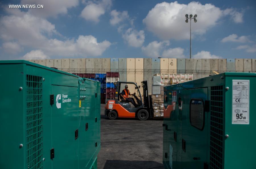 A forklift worker unloads goods ready to be transported into Gaza at Kerem Shalom crossing between Israel and Gaza, on Aug. 28, 2014. Israel fully reopened its commercial crossing with the Hamas-ruled Gaza Strip on Thursday, two days after the long-term ceasefire came into effect. Only limited humanitarian goods were allowed to enter Gaza through the Kerem Shalom crossing, the only commercial crossing in Gaza, since Operation Protective Edge began on July 8. (Xinhua/Li Rui)