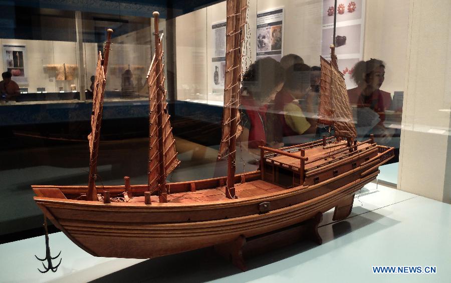 Photo taken on Aug. 28, 2014 shows a model of the ship of Song Dynasty (960-1279) during an antique exhibition of the Maritime Silk Road in Jinan, capital of east China's Shandong Province. The exhibiton, displaying some 300 antiques related to the Maritime Silk Road, opened here Thursday. (Xinhua/Xu Suhui)