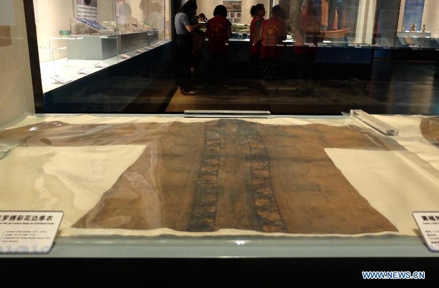 Photo taken on Aug. 28, 2014 shows Chinese silk clothes of Song Dynasty (960-1279) during an antique exhibition of the Maritime Silk Road in Jinan, capital of east China's Shandong Province. The exhibiton, displaying some 300 antiques related to the Maritime Silk Road, opened here Thursday. (Xinhua/Xu Suhui)