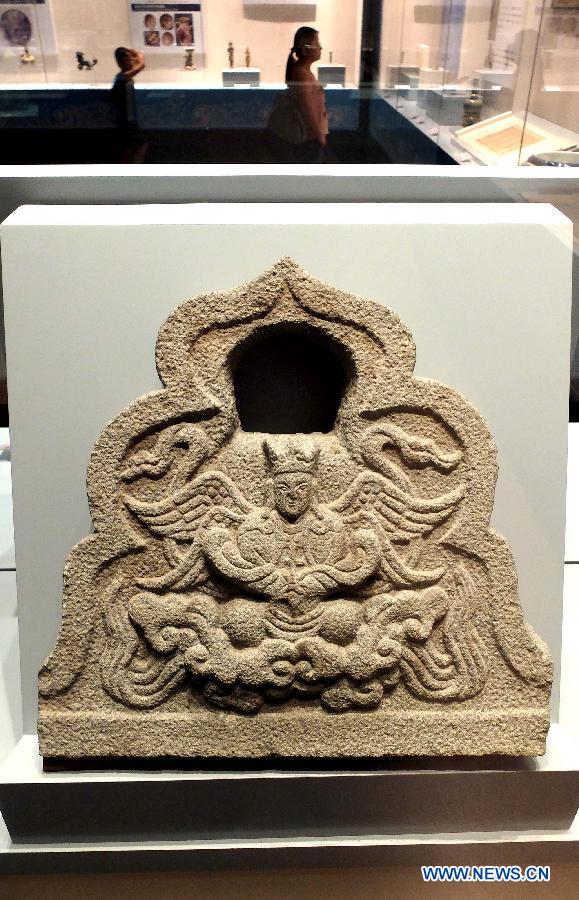 Photo taken on Aug. 28, 2014 shows a displayed stone sculpture of Yuan Dynasty (1271-1368) during an antique exhibition of the Maritime Silk Road in Jinan, capital of east China's Shandong Province. The exhibiton, displaying some 300 antiques related to the Maritime Silk Road, opened here Thursday. (Xinhua/Xu Suhui)
