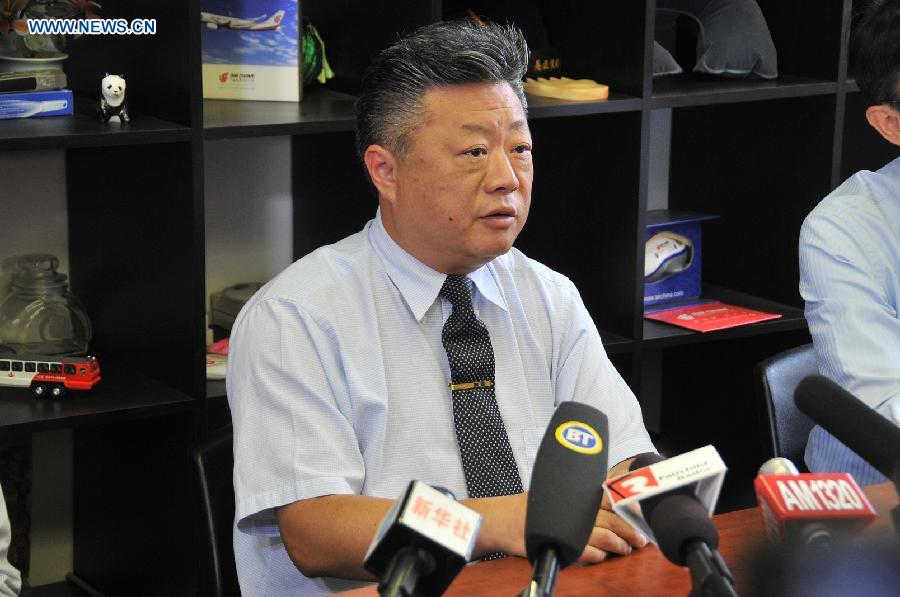 | Nicholas Kam, sales manager of Super Vacation Canada, speaks during a press conference in Vancouver, Canada, Aug. 29, 2014. Fifty-six people were injured, six of them critically, when a tour bus rent by Super Vacation carrying Chinese passengers and others of Asian descent crashed along a major interior highway in the Canadian province of British Columbia on Thursday. These passengers were treated well in various nearby hospitals and they are either in stable conditions or released from the hospitals after being treated properly. (Xinhua/Wan Bin) |