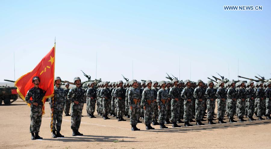Chinese soldiers attend the closing ceremony of the Peace Mission - 2014 military drill in Zhurihe, Inner Mongolia, north China, Aug. 29, 2014. The drill, involving over 7,000 personnel from China, Russia, Kazakhstan, Kyrgyzstan and Tajikistan, member countries of the Shanghai Cooperation Organization (SCO), and expected to hone multilateral decision-making, sharpen joint anti-terror efforts and boost intelligence sharing to ensure regional peace and stability, ended here Friday along with the first edition of the SCO military tattoo. (Xinhua/Zhang Ling)
