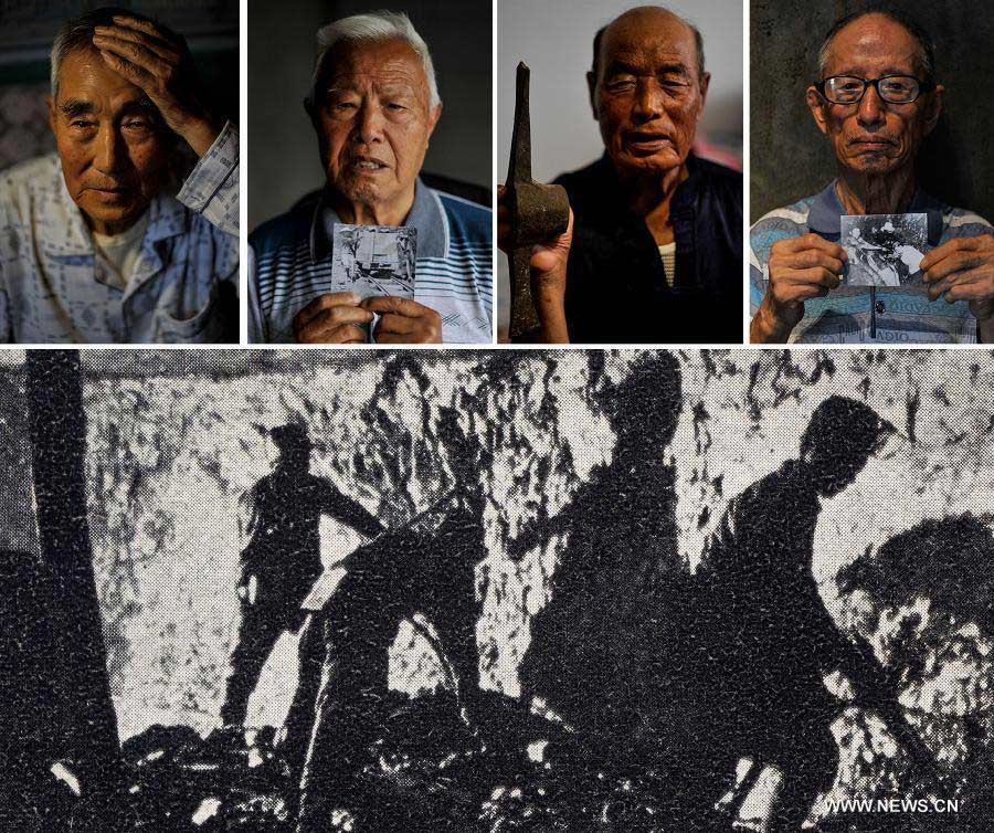 The combined photo shows Chu Qingfang, Liu Qixiang, Wang Zhigong and Sun Yuanxin (up, L to R), who are surviving forced miners working for Japan during the World War II, and the file photo taken in 1943 (down) of forced miners working in a mine in Liaoyuan, northeast China's Jilin Province. The museum of Liaoyuan miners' tomb during Japanese occupation, which keeps 197 forced miners' remains, was an important evidence of Japanese crime of using forced Chinese labor between 1931 and 1945. No more than twenty of the forced miners in Liaoyuan are still alive today. (Xinhua/Wang Haofei)