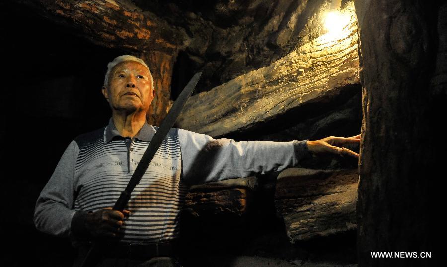 Liu Qixiang, who is a surviving forced miner working for Japan during the World War II, recalls the past at a museum of Liaoyuan miners' tomb during Japanese occupation in Liaoyuan, northeast China's Jilin Province, Aug. 28, 2014. The miners'tomb, which keeps 197 forced miners' remains, was an important evidence of Japanese crime of using forced Chinese labor between 1931 and 1945. No more than twenty of the forced miners in Liaoyuan are still alive today. (Xinhua/Wang Haofei)