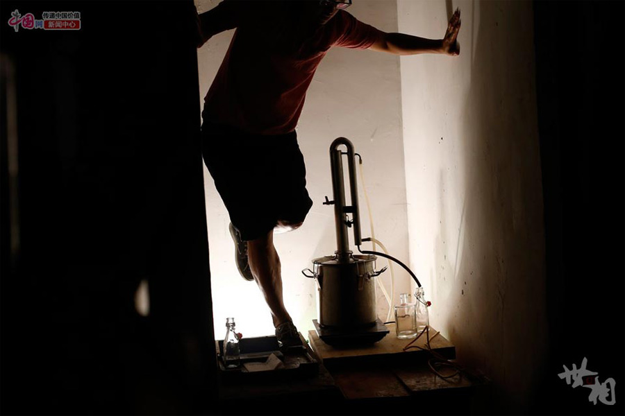 There is a liquor distilling machinery in the bar. (china.org.cn/ Zhang Hao)